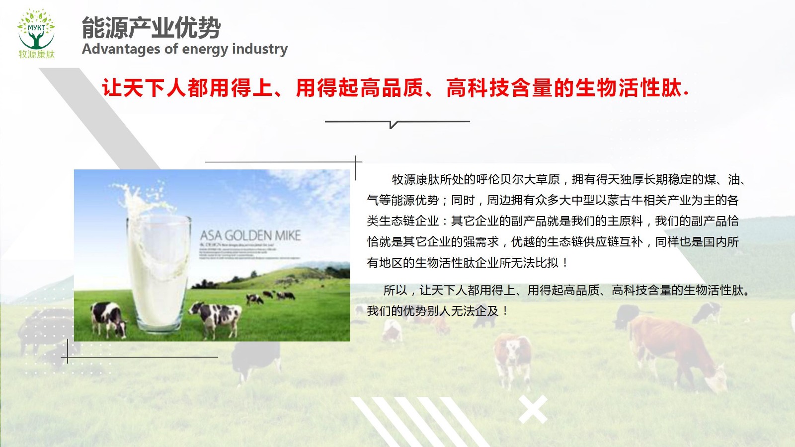 摘要:讓天下人都用得上、用得起高品質(zhì)、高科技含量的生物活性肽.牧源康肽所處的呼倫貝爾大草原,擁有得天獨厚長期穩(wěn)定的煤、油、氣等能源優(yōu)勢;同時,周邊擁有眾多大中型以蒙古牛相關(guān)產(chǎn)業(yè)為主的各類生態(tài)鏈企業(yè):其它企業(yè)的副產(chǎn)品就是我們的主原料,我們的副產(chǎn)品恰...